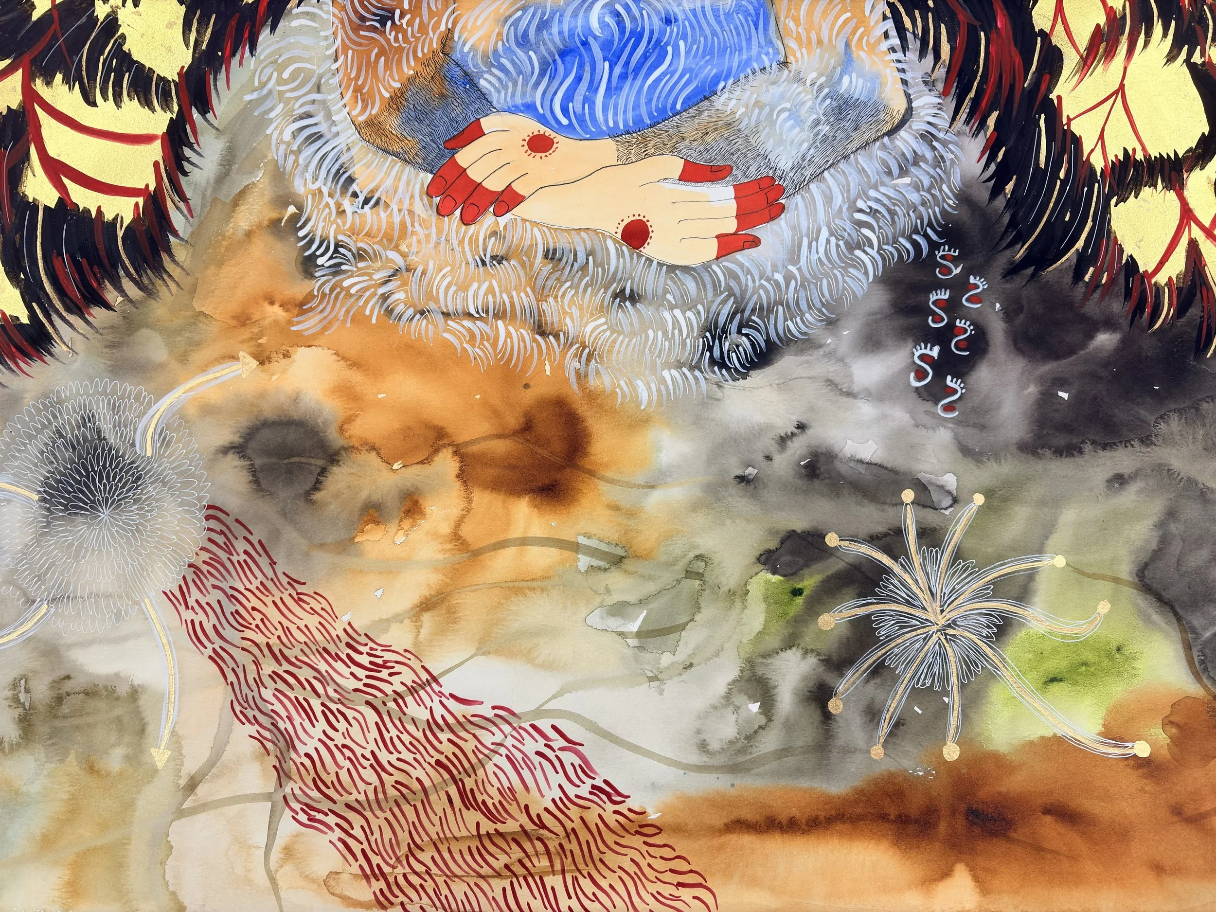 Follow the blood to hold the love — 2024, water color, Ink and 24 Karat gold on acid free paper, 75 x 41inches (detail)