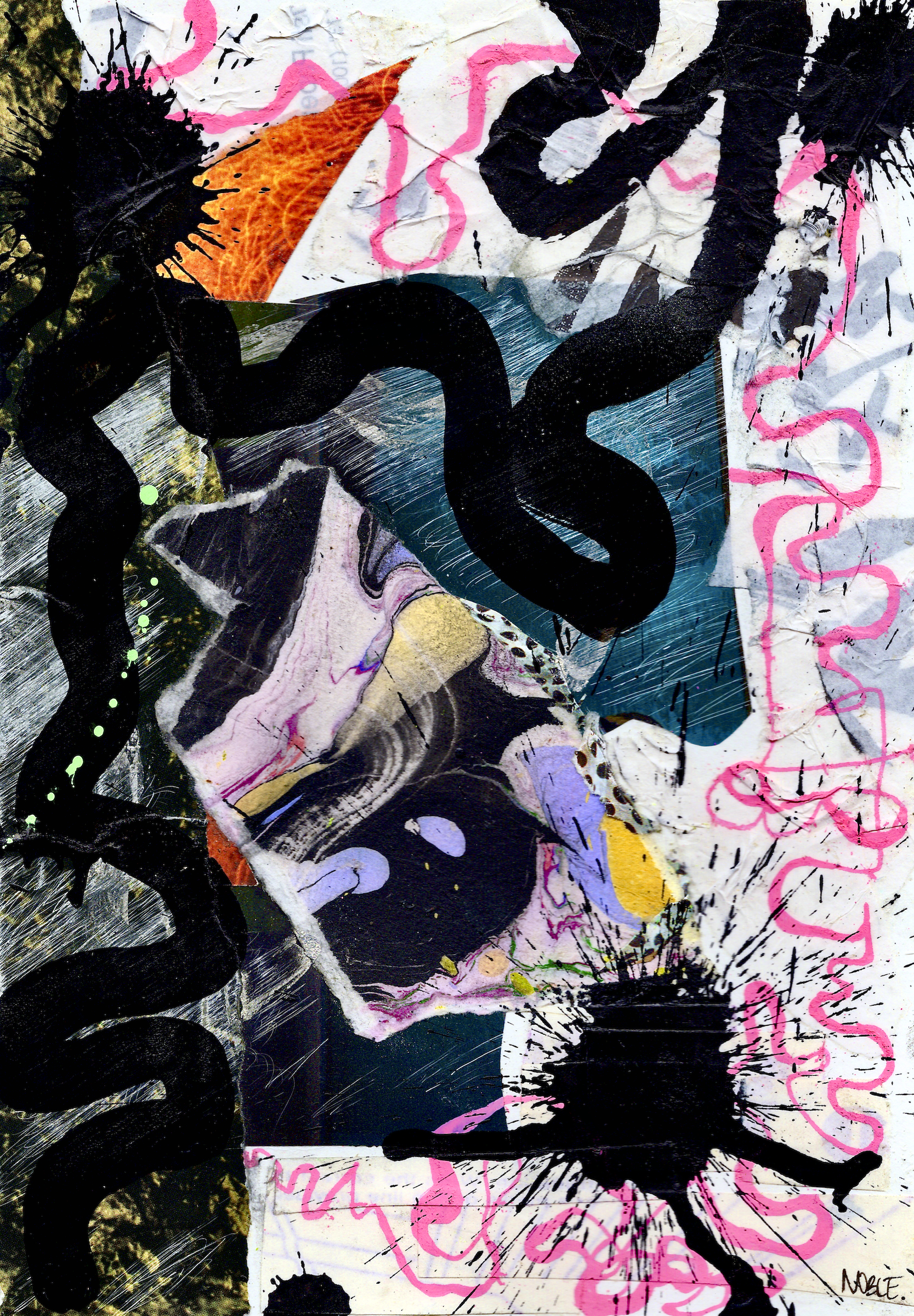 “My art is rooted in fragmented duality. Abstraction allows me to balance oppositional elements, creating surface tension. In Suminagashi - the ancient Japanese art of floating ink - I bend ink on the water’s surface creating patterns of color we cannot reproduce. In abstract collage I get to do the same, incorporating gestural mark making, asemic writing, watercolor inks, paper scraps, and sumi paper to make a style of collage that feels uniquely my own. Finishing my collages often includes scraping the surface of the paper adding imperfection, erasing pencil lines messily, gluing trash or pencil shavings into the art or using splashes of paint to draw the eye in towards easily missed details.Collaging feels like bending time and energy, creating conflict with paper and stability by piecing them back together. Fragments made to fit despite difference, in texture, size, pattern and color. My artistic style balances sharp contrast with hyper pigmented bursts of color, flowing patterns with geometrical cut outs, wrinkles and tears with gestural scratches and thick curving lines. The work I make correlates directly with the complexity of my life experiences. It has provided me comfort and safety moving through impossibility. Hope when there was almost none. Conceptually my work illustrates how my racial identity, disabilities, gender and sexuality, and my survival needs clash with the way I am perceived in the world, the way I struggle to be embraced. I am deeply sensitive, emotionally complex, and evolving. My work is a bid for connection and a representation of me moving through the world - colorful, surprising, sometimes harsh, but full of light.”